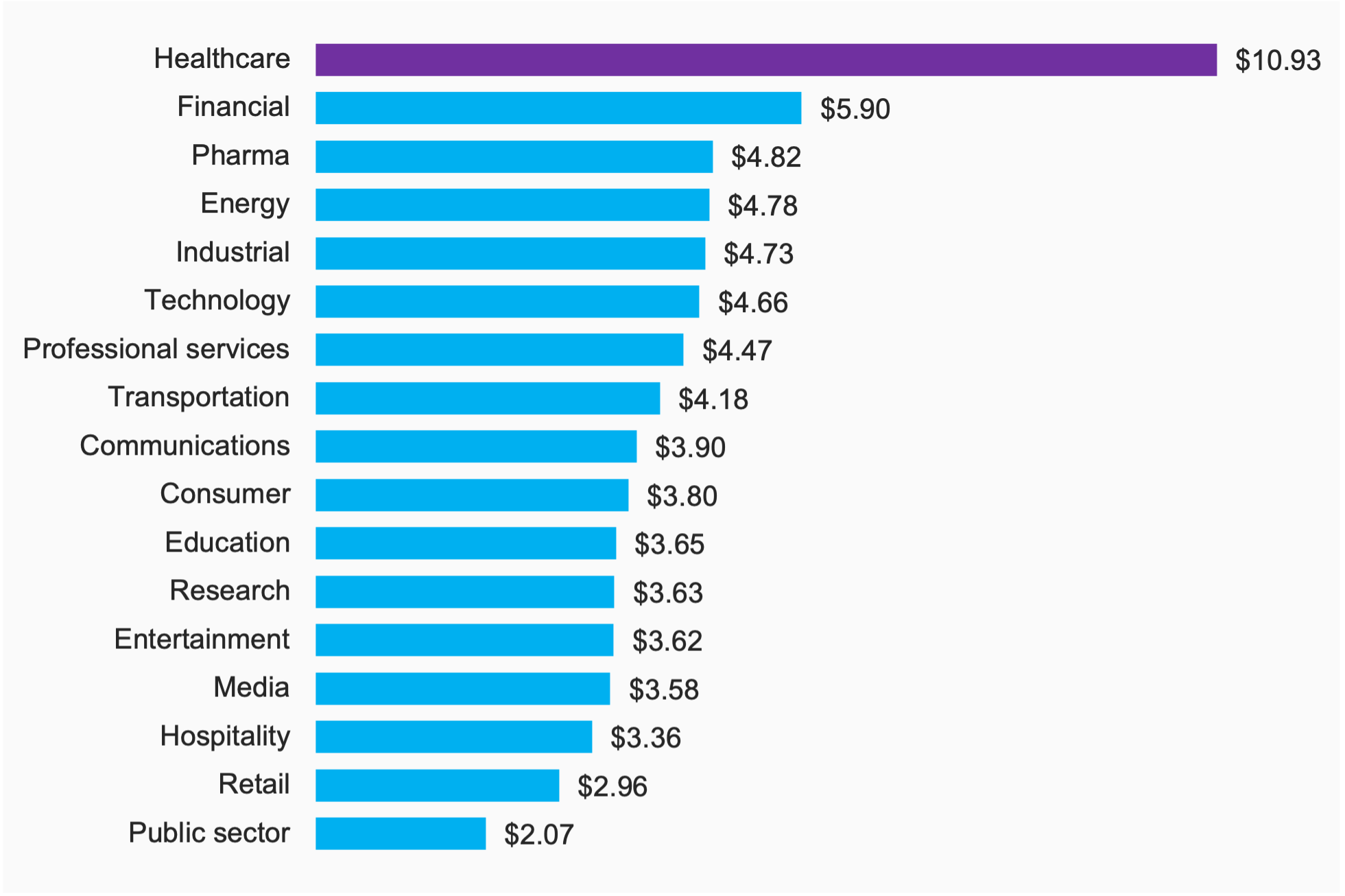 Dintre toate industriile, domeniul sănătății continuă să înregistreze cele mai mari costuri de încălcare a securității datelor (creștere de 8,2%, la 10,93 milioane USD în 2023). În ultimii trei ani, costul mediu al unei breșe de securitate a datelor în domeniul sănătății a crescut cu 53,3%.