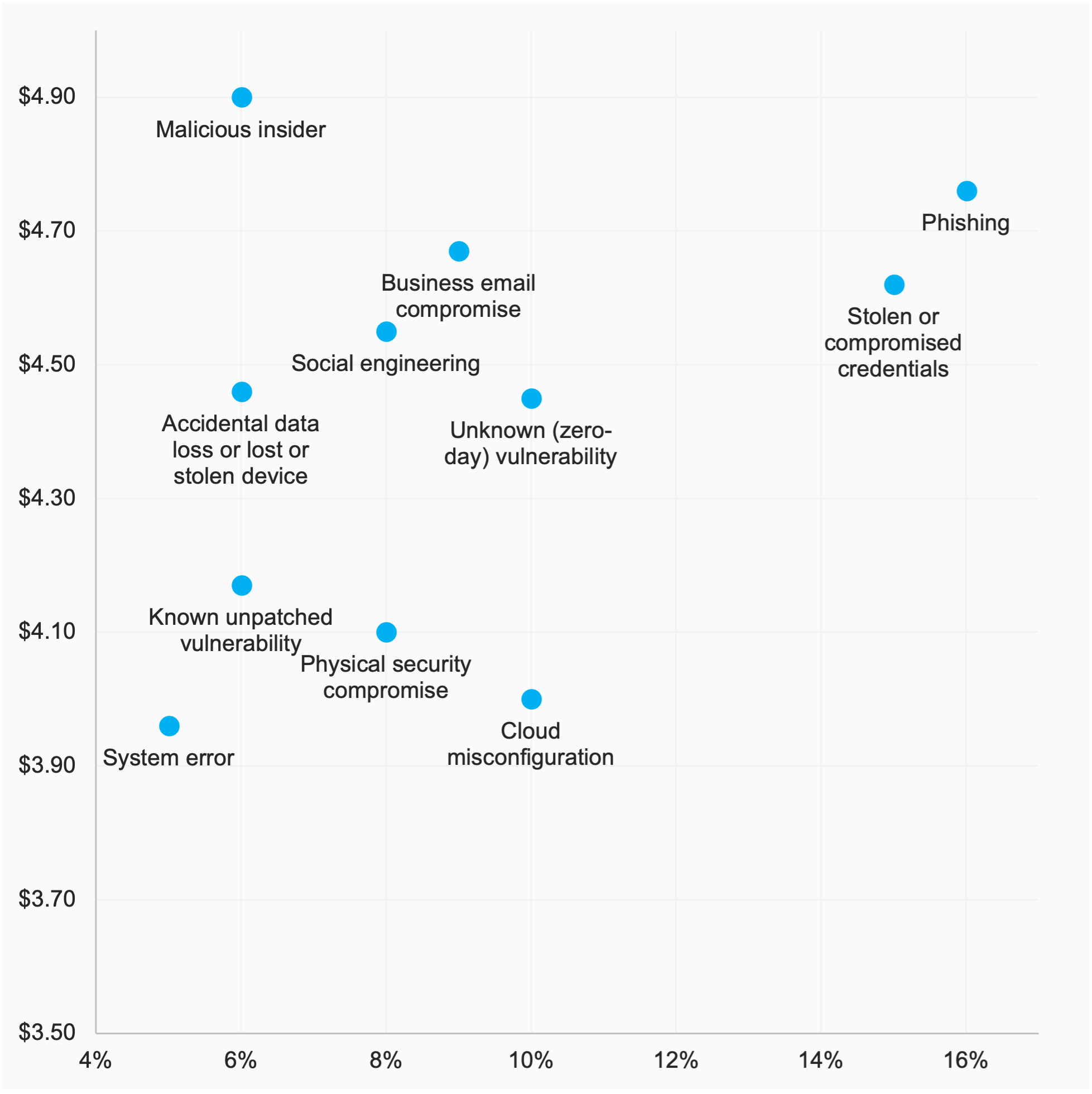 Deși relativ rare (6%), atacurile lansate de persoane rău intenționate din interior au fost cele mai costisitoare (în medie 4,90 milioane USD). Phishing-ul a fost cel mai răspândit vector de atac și al doilea cel mai costisitor (4,76 milioane USD). Încălcările atribuite erorilor de sistem au fost cele mai puțin costisitoare (în medie de 3,96 milioane USD), și cele mai puțin frecvente (5% din cazuri).