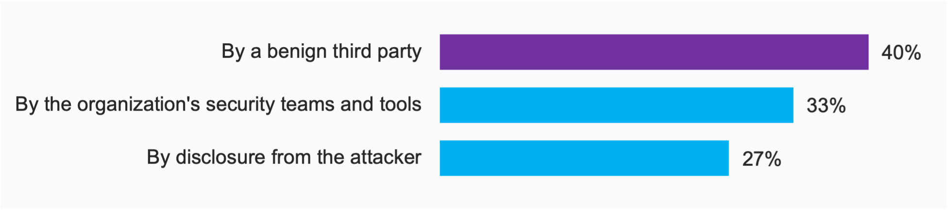 40% dintre încălcări au fost identificate de o terță parte benignă sau de o persoană din exterior, în timp ce 33% dintre încălcări au fost identificate de echipe și instrumente interne. Mai mult de un sfert sau 27% dintre încălcări au fost dezvăluite de atacator ca parte a unui atac ransomware.